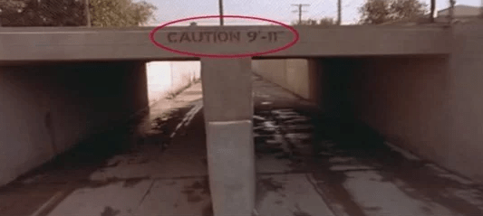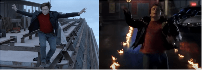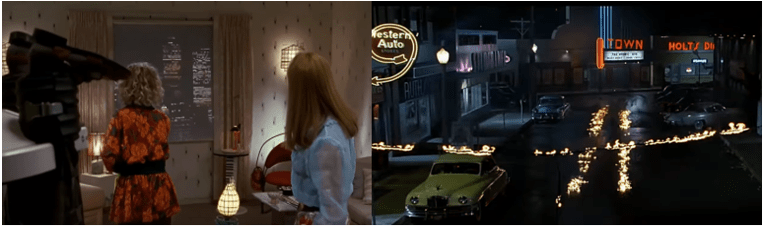 While Marty is in the future, he finds himself inside his home to be. In this still frame, you will notice his dad, George McFly, is upside down gazing at the twin towers. At this very moment, the screen glitches and the towers go up into the ceiling but from George’s vantage point, they would appear to be collapsing down to the ground. To be sure this isn’t by mistake, the Statue of Liberty torch was neatly placed on the coffee table. Ever heard of the saying: we live in an upside-down world? Touché. The image on the right occurs after the DeLorean passes under the wire from the clock tower strike. In its wake, a burning 11 blazes toward a theater which is conveniently accompanied by the western auto sign in the shape of a 9. Is the whole world a stage?