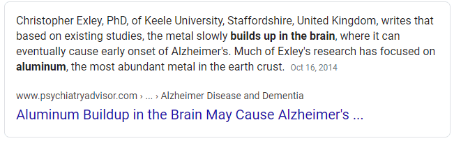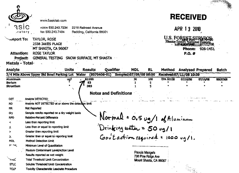 According to the State Water Board of California, safe consumption levels of Aluminum (which is questionable at best) is listed as 1,000 parts per billion (ppb). Samples taken from Mt. Shasta, California from 2010, showed an astounding 61,100ppb! Local campers and hikers were unknowingly drinking water with over 60x the suggested amount of aluminum. Where’s the EPA or any other alphabet agency that care so much about the environment and public safety? What a joke.